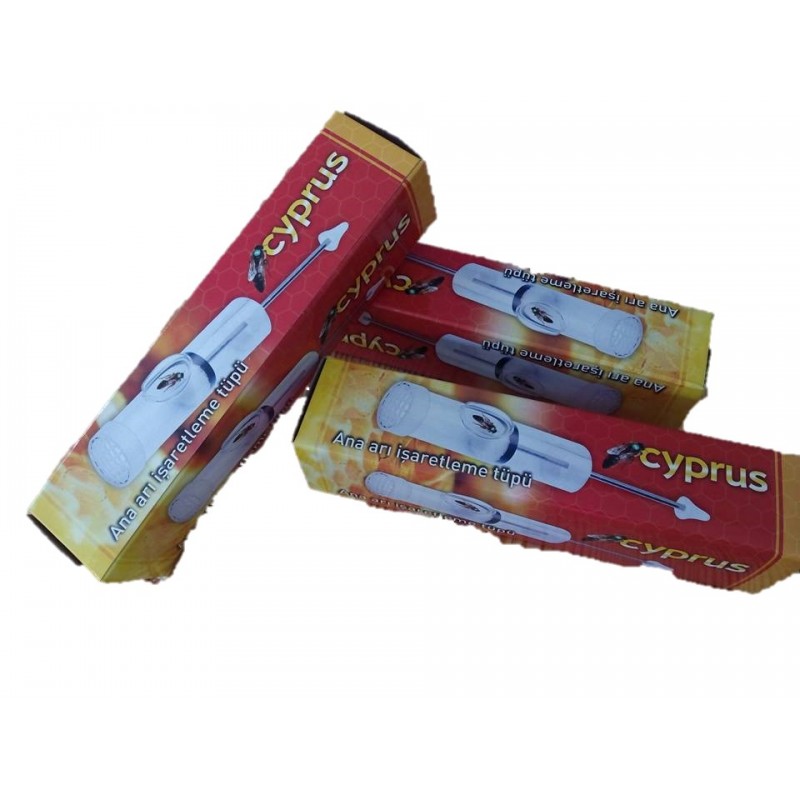 Jaula-pistón marcador de reinas de plástico. Dispone de un orificio lateral de entrada y salida para las reinas. Una vez introducidas dentro del tubo, se aproximan con el máximo cuidado de no aplastarlas al extremo enrejillado para marcarlas con el color o número deseado.