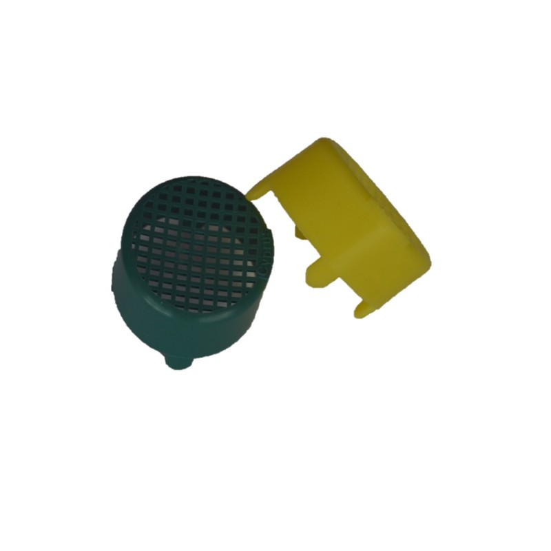 Jaula-pistón marcador de reinas de plástico. Dispone de un orificio lateral de entrada y salida para las reinas. Una vez introducidas dentro del tubo, se aproximan con el máximo cuidado de no aplastarlas al extremo enrejillado para marcarlas con el color o número deseado.