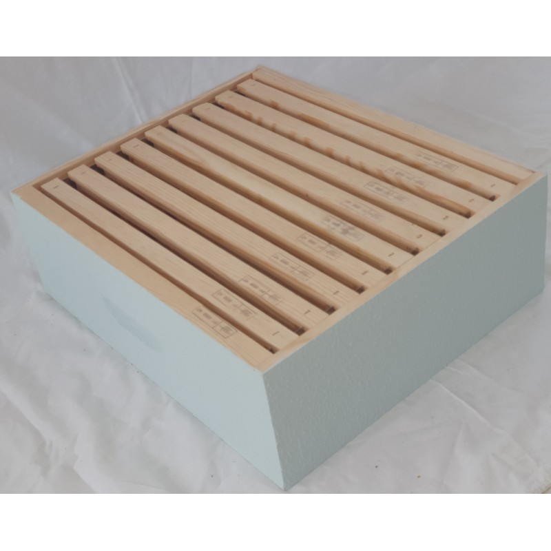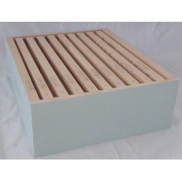 Media alza dadant 9 cuadros lisos alambrados y tensados de 16 de alto. Fabricadas en madera de pino tratadas con aceite de linaza y con esquinas entrelazadas y clavadas.