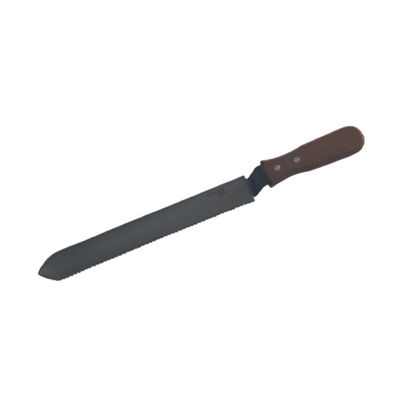 Cuchillo desopercular 1 sierra inoxidable con mango de madera. Hoja de 1,5 mm en acero inoxidable 420 y mango plano de madera. Ideal para el desoperculado de cualquier tipo de cuadro. La sierra facilita mucho el corte de la cera y funciona incluso sin calentarlo previamente en agua. Medidas: 36cm de largo x 3.5 cm de ancho Peso: 0.145 g
