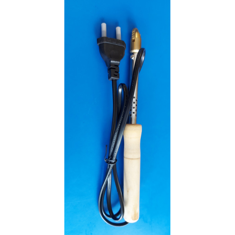 Espuela eléctrica, se conecta a la luz y una vez caliente se pasa por encima de la cera donde apoya el alambre, de manera que queda incrustada en el mismo.