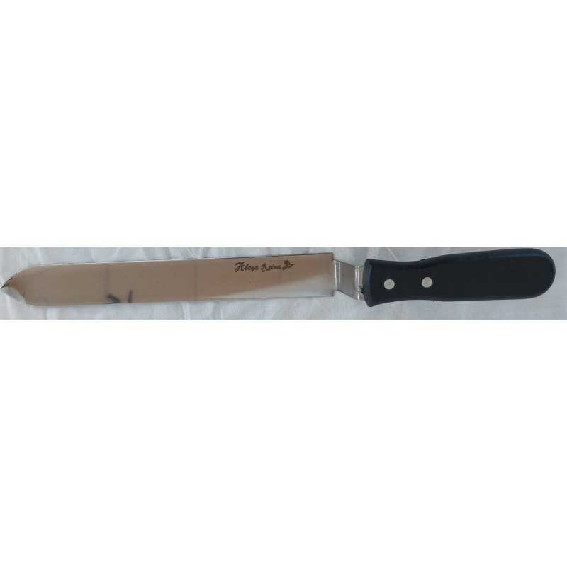 Cuchillo desopercular 1 sierra inoxidable con mango de madera. Hoja de 1,5 mm en acero inoxidable 420 y mango plano de madera. Ideal para el desoperculado de cualquier tipo de cuadro. La sierra facilita mucho el corte de la cera y funciona incluso sin calentarlo previamente en agua. Medidas: 36cm de largo x 3.5 cm de ancho Peso: 0.145 g