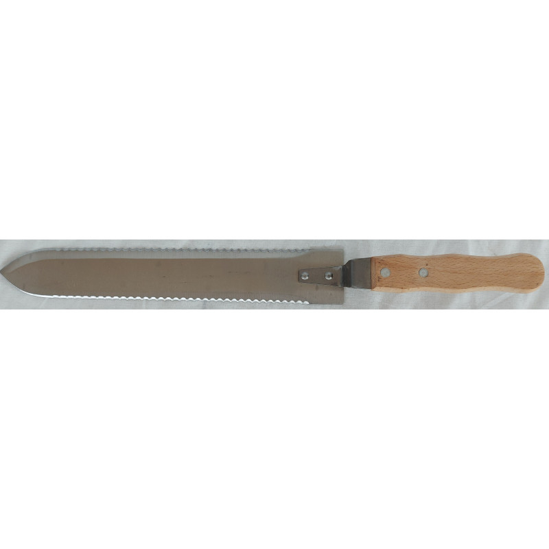 Cuchillo desopercular 2 sierras inoxidables con mango de madera. Hoja de 1,5 mm en acero inoxidable 420 y mango plano de madera. Ideal para el desoperculado de cualquier tipo de cuadro. La sierra facilita mucho el corte de la cera y funciona incluso sin calentarlo previamente en agua. Medidas: 43 cm de largo x 3,5 cm de ancho Peso: 0.170gr