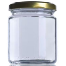Tarro hexagonal Capacidad: 106 ml. Peso: 100 gr. Diámetro: 68,00/ 60,20 mm Altura: 55,50 mm Color: Vidrio blanco Boca: Twist off TO 53 ( no incluida) Pack de 20 unidades.